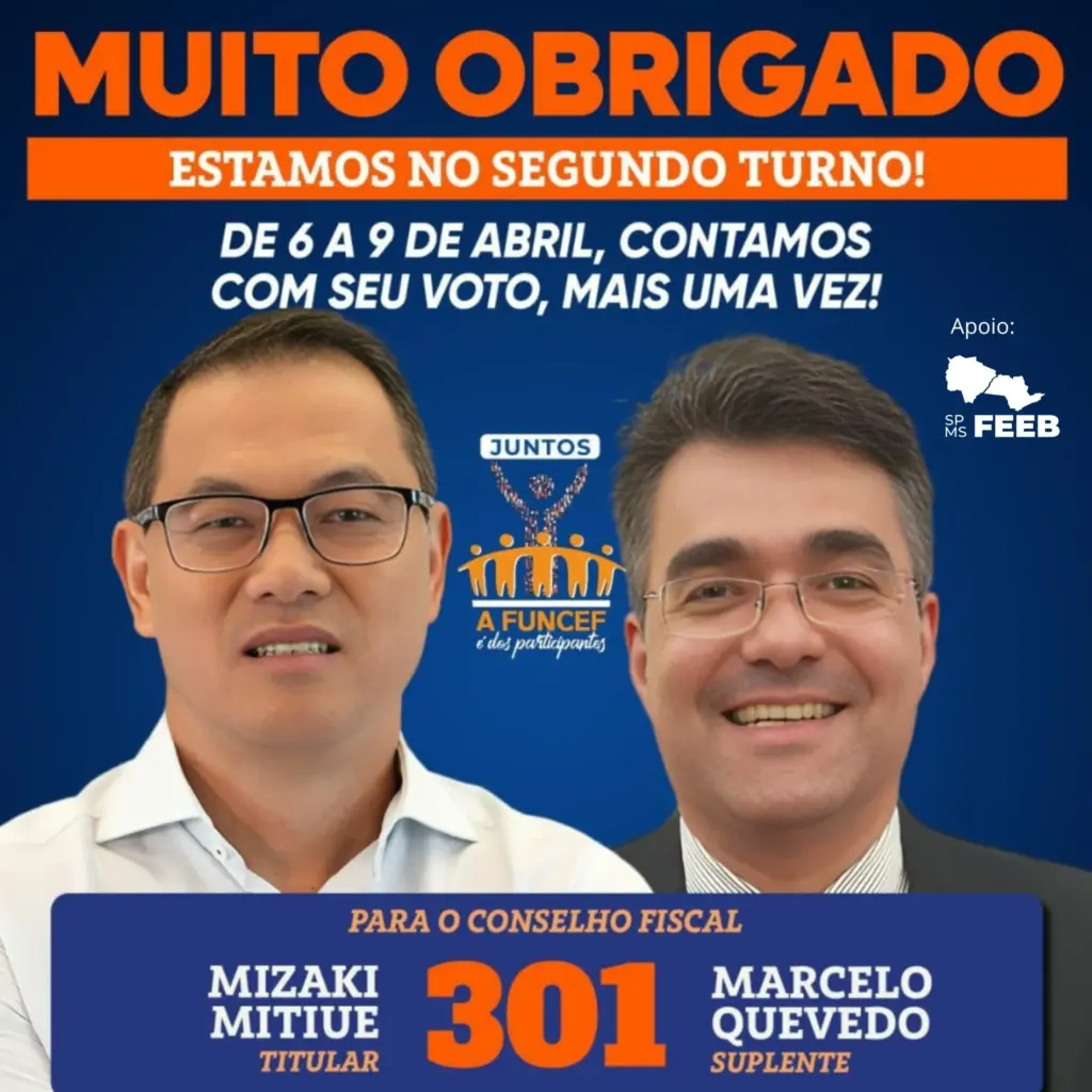 Com 43,99% dos votos válidos no primeiro turno, chapa 301, Mizaki Mitiue e Marcelo Quevedo, segue na disputa pelo Conselho Fiscal; votação do segundo turno ocorre de 6 a 9 de abril. Os candidatos apoiados pela Federação dos Empregados em Estabelecimentos Bancários dos Estados de São Paulo e Mato Grosso do Sul (Feeb SP/MS), em […]